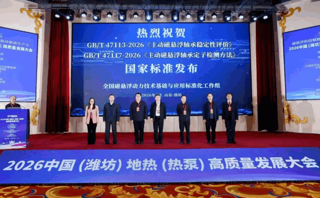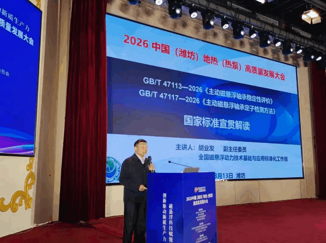 2026年3月13日,在2026中国(潍坊)地热(热泵)高质量发展大会上,全国磁悬浮动力技术基础与应用标准化工作组主任委员郭大雷、副主任委员胡业发、秘书长张婕妤、副秘书长郑铁民应邀参加大会,并与与会嘉宾共同为《主动磁悬浮轴承稳定性评价》(GB/T 47113—2026)、《主动磁悬浮轴承定子检测方法》(GB/T 47117—2026)两项国家标准揭幕。工作组副主任委员、标准起草组代表、武汉理工大学教授胡业发对这两项标准进行了宣贯解读。