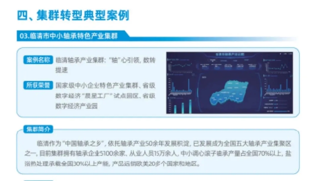 近日,山东省工业和信息化厅印发《山东省“十四五” 制造业数字化转型发展报告》,公布全省制造业数字化转型典型案例名单,临清市中小轴承特色产业集群成功入选集群转型典型案例。